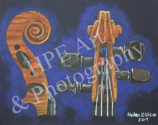 The painting is of the violin scroll from the front which displays the strings wound round the pegs inside the pegbox. This painting is one of a pair, the other painting is a view from the back of the violin scroll displaying the flame-like wood colouring and shape. They are available to buy, ideally as a pair. Price available on request.