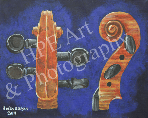 The painting is of the violin scroll from the back which displays the curve of the peg box displaying the flame-like wood colouring and shape. This painting is one of a pair, the other painting is a view from the front of the violin scroll displaying the strings wound round the pegs inside the pegbox. They are available to buy, ideally as a pair. Price available on request.